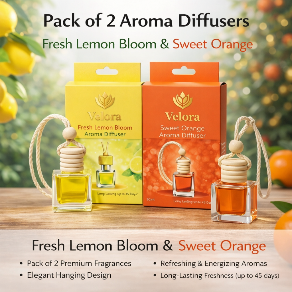 Bring vibrant energy and refreshing positivity to every journey with the Velora Pack of 2 Car Aroma Diffusers featuring Fresh Lemon Bloom and Sweet Orange. This dynamic citrus duo is designed to instantly uplift your mood while keeping your car interior clean, fresh, and inviting.