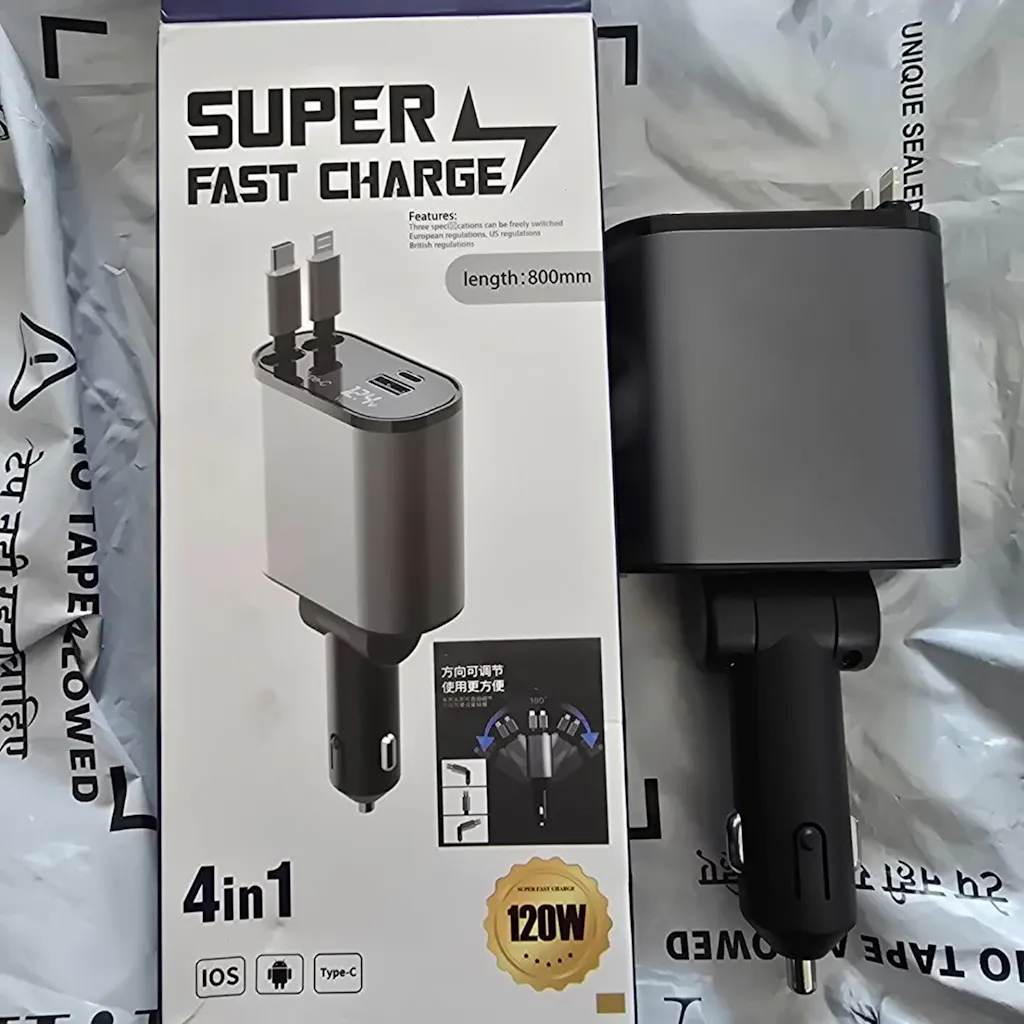 New 4 in 1 Retractable cable 2 Type C and iPhone Fast Charging Car Phone Charger 120W